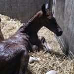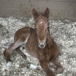 We had seven foals at the farm, one in Holland, and three in Indiana. The foals began arriving early, and kept coming until August. Thanks to some new foaling cameras in the foaling stalls, I spent more time sleeping in my own bed, checking my laptop, than I did sitting in the barn dealing with mosquitos and dirty Golden Retrievers wanting to be lap dogs. Still, it was a long foaling season. Knock on wood, all ended well. We had one really scary foaling–the last baby was upside down. Of course, when I realized the feet were facing up, I was sure she was breached, but once I put my arm in the mare, her nose was between her legs. We’ve had mares foal standing up, a couple legs that needed to be repositioned, a prolapsed uterus, a couple red bags, and a mare that cast herself during foaling so the foal fell back into a terrible position, but this is the first upside down foal in our 28 foaling seasons. I don’t want another one. Again, knock on wood, it all ended well.