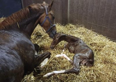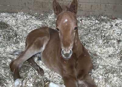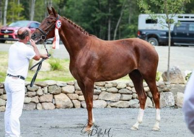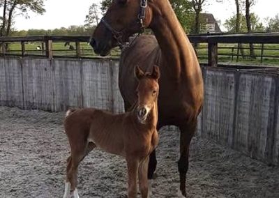 The young mare Paeonia SSF (by Vivino) is a daughter of Hyacintia (Charmeur x Santano). We imported her after weaning. She received the ster and Keur eligible predicate at her studbook inspection in 2023 and also won the title of Reserve Champion Dressage mare. In 2024 at the Keuring at our farm, Erin Duffy presented Paonia under saddle for her Ibop. She succeeded and received her Keur and Elite predicate. This year, she gave us a beautiful foal by Escaneno, Versace SSF.